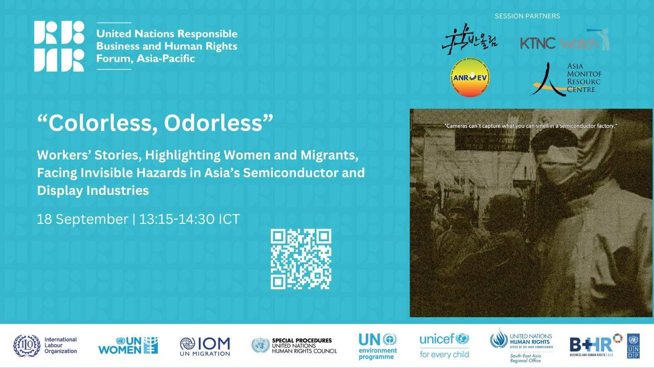 2025년 9월 17일, 태국 방콕 유엔컨퍼런스센터에서 열린 ‘유엔 아시아-태평양 기업과 인권 포럼(United Nations Responsible Business and Human Rights Forum, Asia-Pacific)’ 개회식에서 반도체 노동자의 건강과 인권지킴이 반올림(약칭 ‘반올림’)의 정향숙 활동가는 삼성전자 반도체 공장 직업병 피해자로서 자신의 경험과 함께 반도체 산업 공급망에서 벌어지는 건강권 환경권 문제를 국제사회에 알리며, 한국을 비롯한 해외 사업장에서도 더 이상 직업병 피해가 반복되지 않도록 “공급망에서의 기업 책무성을 위한 효과적인 수단으로서의 실사법 제정을 촉구”하였다. 참석석자들은 직업병 피해자가 직접 전하는 삼성의 노동, 환경 문제를 듣고 ” 발표가 강렬하고, 울림이 컸다” 며 뜨거운 반응을 보였다. 유엔 포럼 개회식에 발표를 함께 준비한 기업과인권네트워크 활동가들도 특정 기업 삼성이 두 번이나 언급된 “인상적인 개회식 발언이다” 말했다.