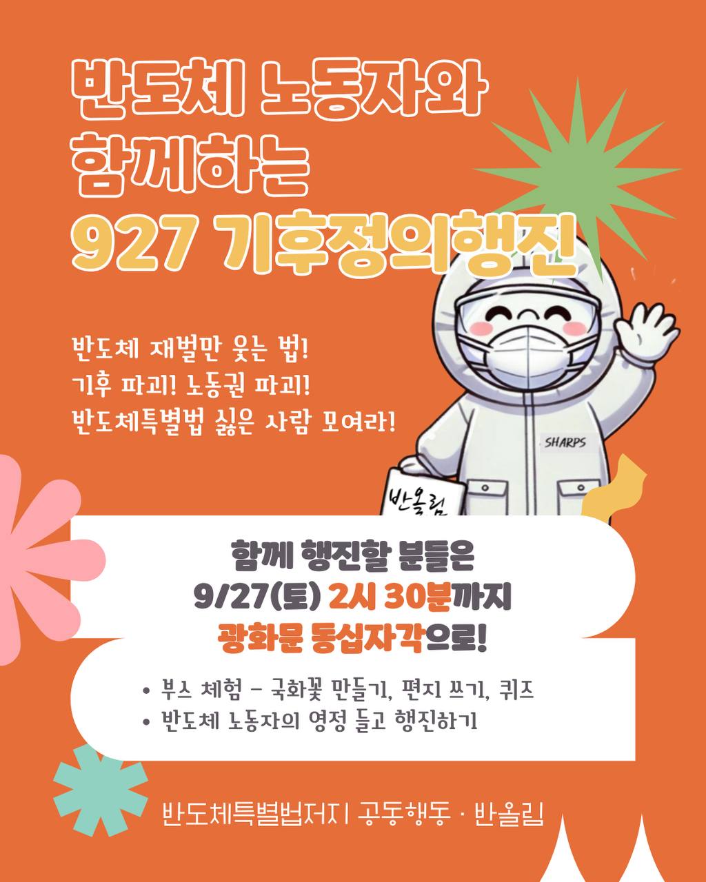 💌 927 기후정의행진에 함께 갈 준비를 잘 하고 계신가요? 오늘은 반도체를 만드는 노동자와 지역사회, 우리 모두의 미래에 대해 함께 고민하자는 반올림의 이야기를 가져왔습니다. 함께 읽고 더 평등한 미래로, 공공성으로, 기후정의로 행진해요!