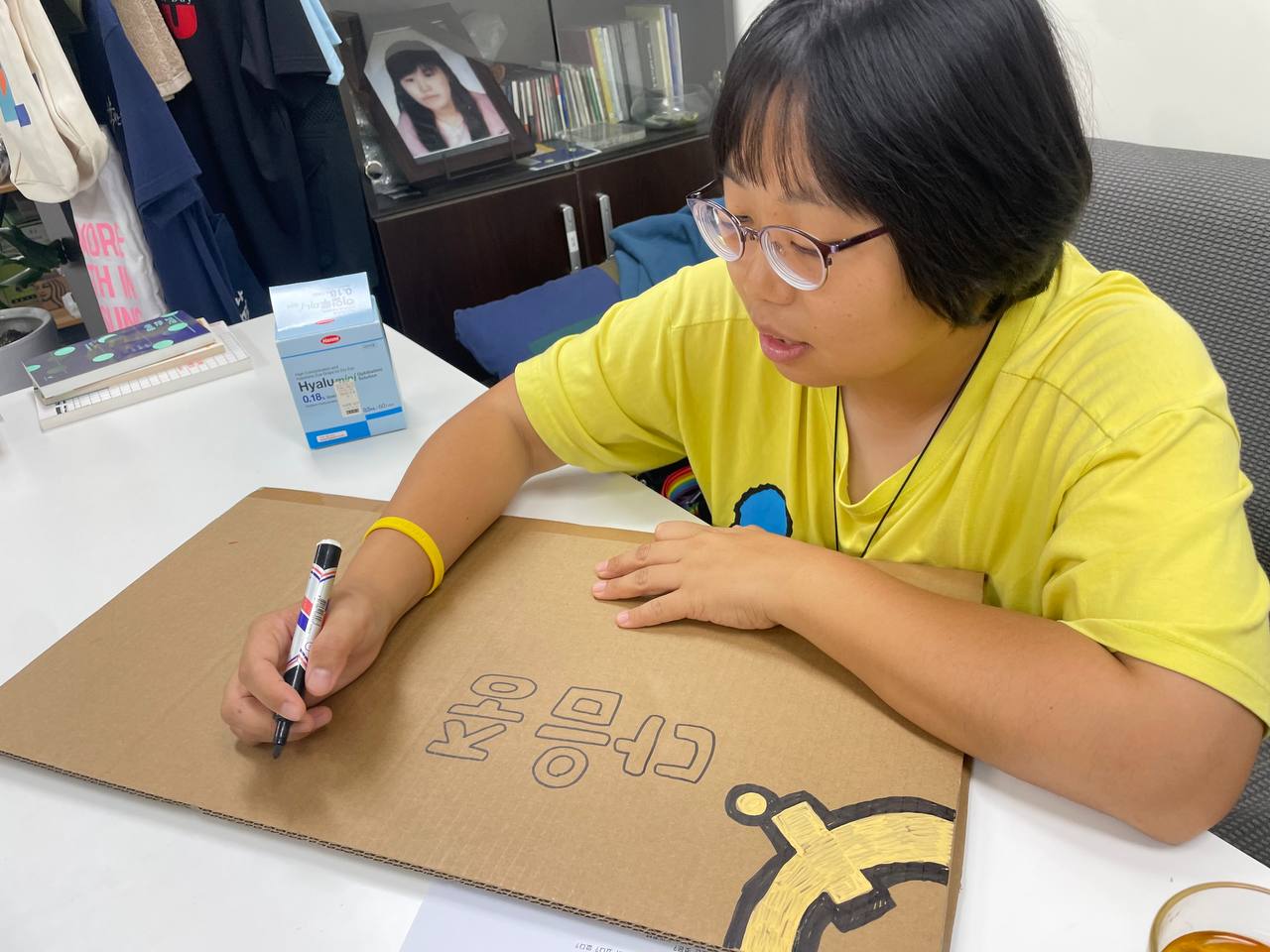회의, 상담, 업무, 교육, 휴식, 피켓 만들기 등 상임활동가 + 자원활동가 9명이 9평에서 활동 중! 반올림 이사가고싶어요.